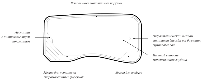 Бассейн постоянно находится под давлением массива почвы с одной стороны и тонн воды — с другой. Чтобы выдерживать такие нагрузки, чашу изготавливают из нескольких слоёв: полиэстер, винилэстер, стекловолокно, углеродное волокно и прочих. Чтобы сделать бассейн ещё прочнее, его усиливают ребрами жёсткости. В их состав входит древесина бальза — прочная, очень лёгкая, с отличными показателями теплоизоляции.